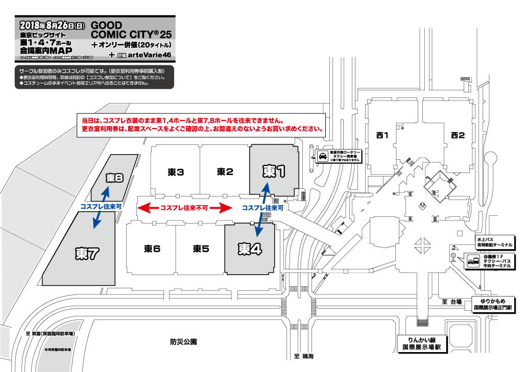 当日は他催事の開催や搬入が予定されております。会場指導によりコスプレ衣装のまま東1,4ホールと東7,8ホールを往来することはできません。 | ||||||
