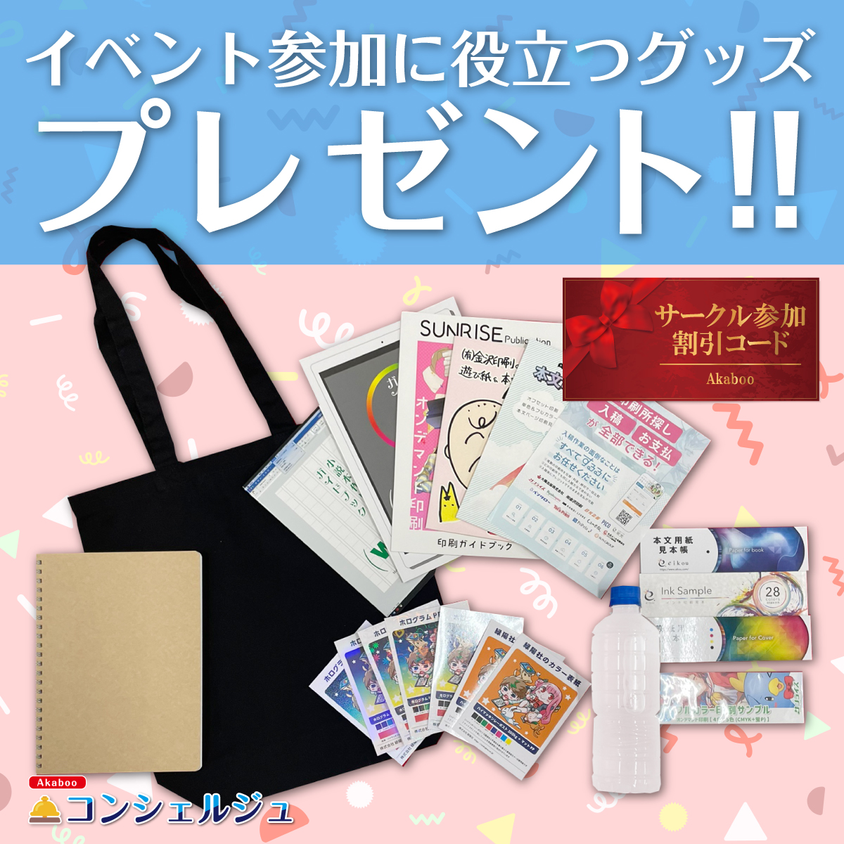参加された方には赤ブーブー通信社より記念品セットをプレゼント!同人誌即売会の必需品であるトートバッグ・スケッチブック、サークル参加デビューを応援するここでしか手に入らない印刷所サンプルセット(非売品)やサークル参加割引コードなど豪華特典を用意してお待ちしております。