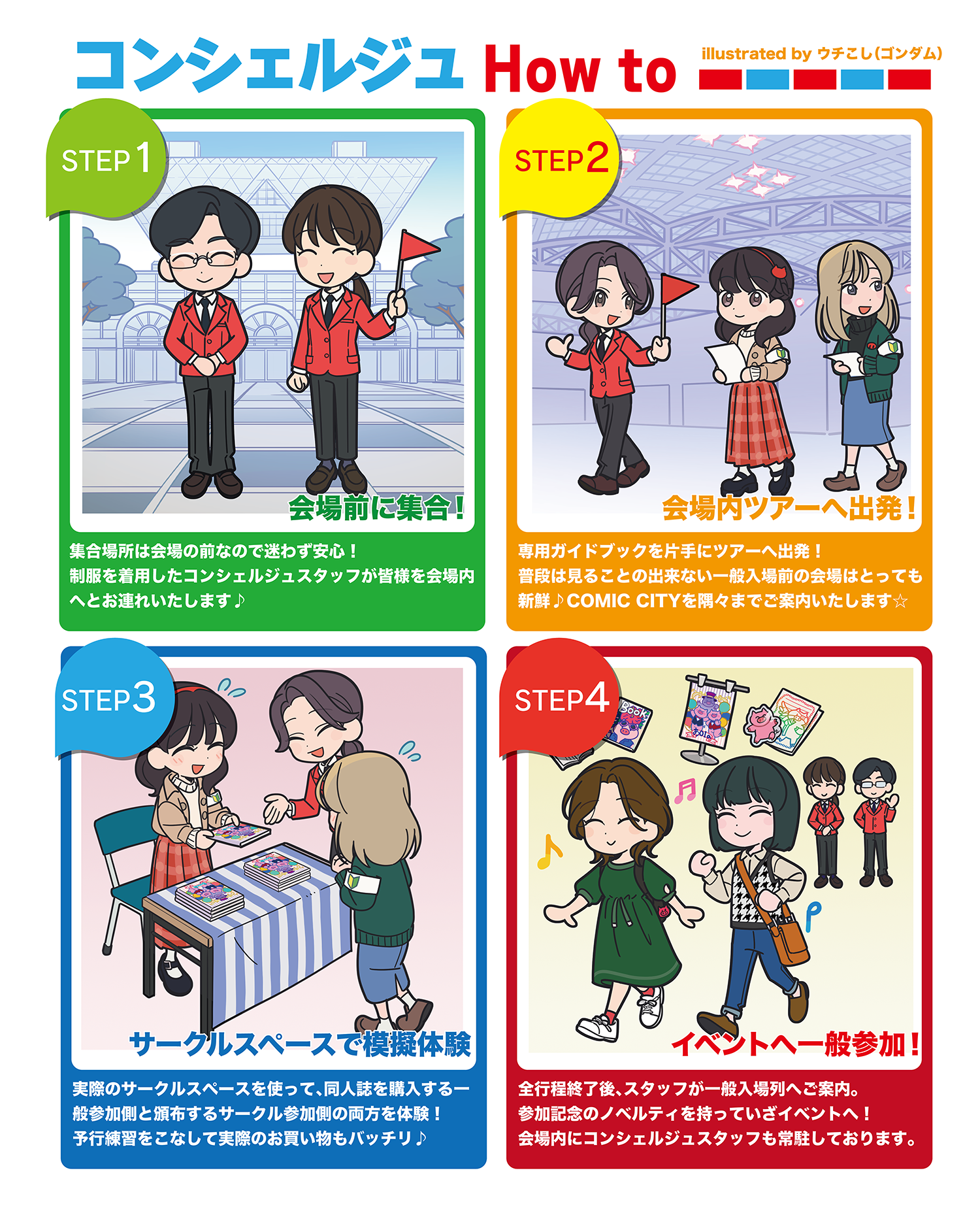 一般初参加の⽅でも安⼼して体験していただけるよう専⽤ガイドブックを各⾃に配布しCOMIC CITY を専任スタッフが手厚くご案内いたします。