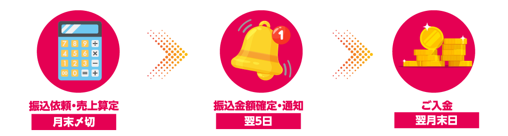 ご依頼から振込のサイクルは、毎月末締めの翌月末日振込となります。振込のご依頼はいつでも可能です。