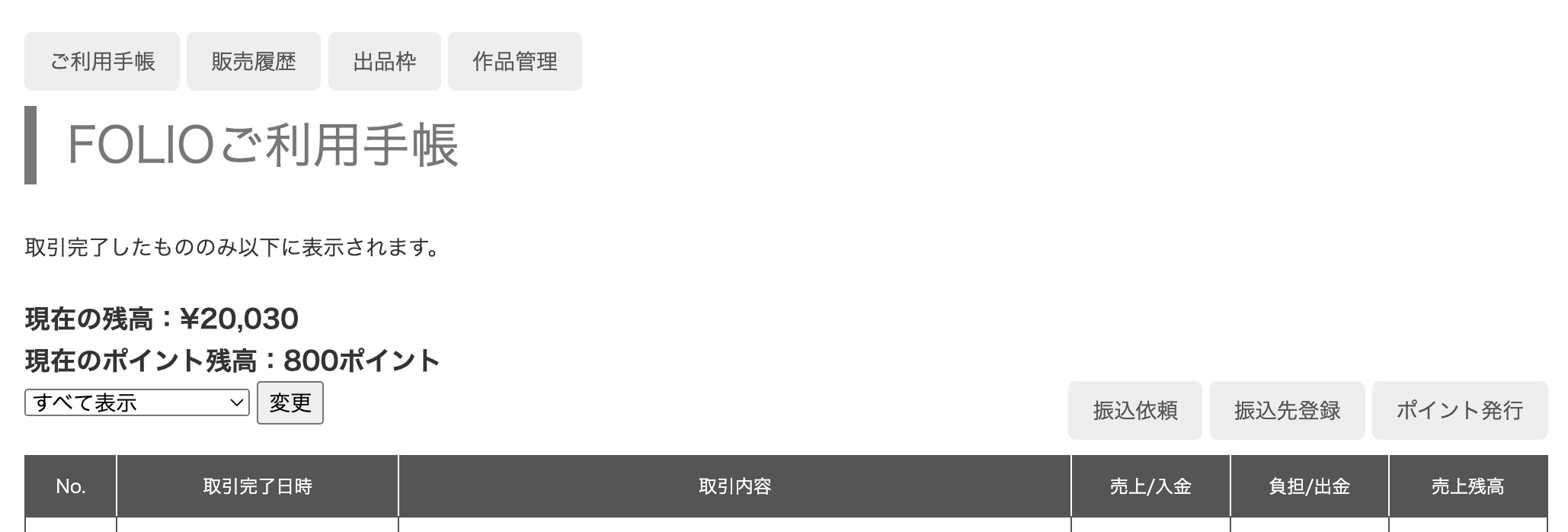 予め振込先口座の登録を済ませ、期日までに振込依頼を行ってください。振込依頼の手続きはFOLIOメニュー【売上管理】ページにある【振込依頼】から可能です。