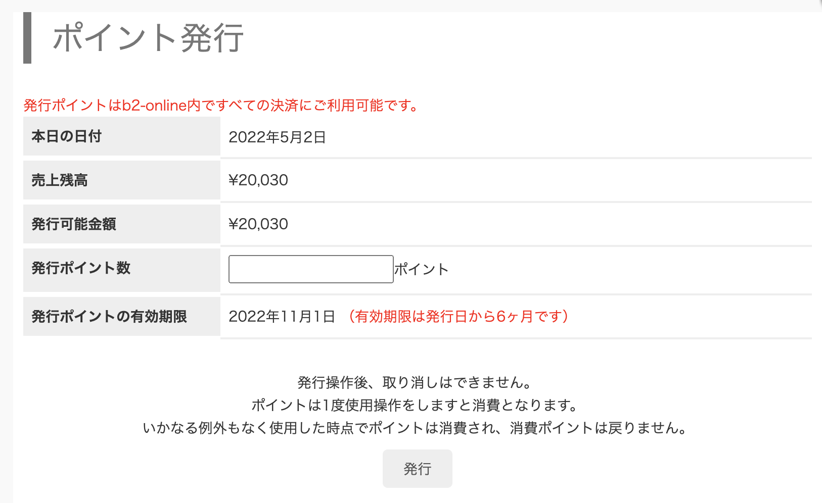 発行画面にある表の上から、本日の日付、売上残高、発行可能金額、発行ポイント入力フィールド、発行ポイントの有効期限日(操作をした日付)の順に並んでいます。