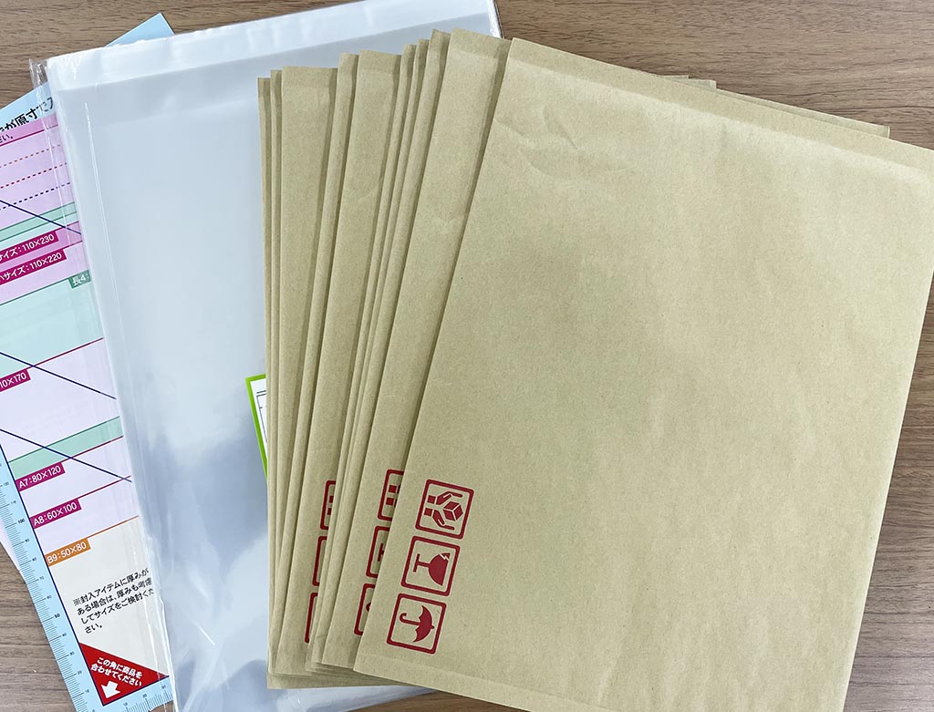 A4クッション封筒などがお奨めです。折れ防止に厚紙やクリアケースを利用される方もいらっしゃいます。必要に応じてOPP袋などで防水対策をしておきましょう。