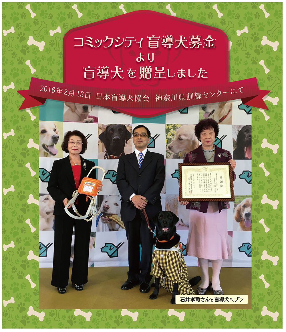 ![]() ![]() ![]() 皆様の寄付を募る募金箱を特設コーナーに設けております。 多くの視覚障がい者の方が、盲導犬を必要としています。 視覚障がい者のための盲導犬育成事業のご理解と募金にご協力をお願いします。 毎回会場内に特設の啓発・募金コーナーを設けております。啓発活動の一環として、実際の盲導犬が来場しています。 通常、仕事中の盲導犬には、触ることをご遠慮いただいておりますが、募金コーナーでは特別にハーネスを外してお待ちしています。この機会に是非、触れ合ってみてください。 ![]() 啓発・募金コーナーでは盲導犬チャリティグッズも販売しています。是非、お立ちよりください。 これらグッズの売上金の一部は、盲導犬育成に役立てられます。 日本盲導犬協会とは? 公益財団法人 日本盲導犬協会は、1967年に日本で最初に誕生した盲導犬育成団体です。 盲導犬の育成と視覚障がいリハビリテーション事業を通して視覚障がい者の社会参加を促進し、視覚障がい者福祉の増進に寄与することを目的に様々な事業を行っています。 活動は啓発拠点となる東京本部を中心に、国内4箇所(宮城・神奈川・静岡・島根)の盲導犬育成施設において、繁殖・飼育・訓練を行う育成の他、リタイア犬のケアも行っています。 平成20年は『年間50頭の盲導犬育成』を掲げ、見事にこれを達成されました。 盲導犬は、目の不自由な方の歩行をサポートする大切なパートナーです。 盲導犬は、障害物を避けたり、段差を教えたりするだけでなく、視覚に障害のある方々に前に進む勇気、希望、自信をもたらす意味でもサポートしています。 盲導犬と歩くことによって、多くの方々が笑顔を取り戻しました。 しかし、日本では1,067 頭(2011年3月現在)の盲導犬が活躍していますが、現在盲導犬を今すぐ希望する方4,700名、これに将来希望する方を含めると約7,800 名(平成10年度 日本財団調査)となり、目の不自由な方のニーズに追いついていないのが現状です。 盲導犬の育成は皆様のご寄付に支えられています。 1頭でも多くの盲導犬を育成し、1人でも多くの目の不自由な方に盲導犬をお届けするために、皆様の温かいご支援をお願いいたします。