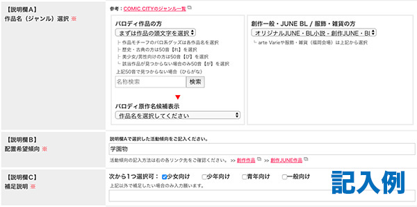 ジャンル説明欄(作品・キャラ)の入力は記入方法に沿って、省略せず正確にご記入をお願いします。配置スペースを最適化するにはこれら情報が不可欠です。以下にオンラインエントリーにおける画面案内を掲載しております。参考にご覧ください。