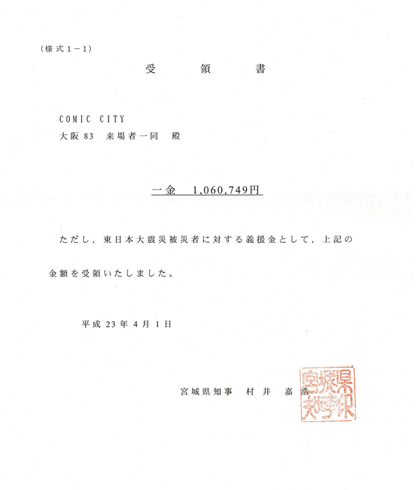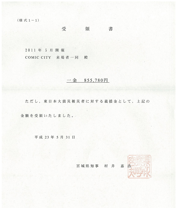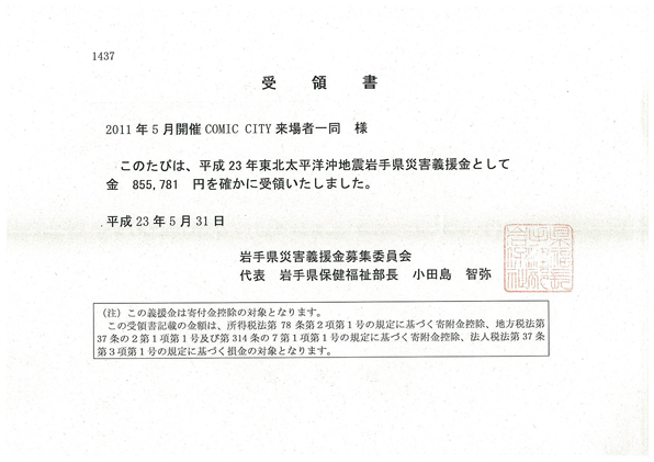 総額 ¥2,772,310- 宮城県・岩手県へそれぞれ送金致しました。 送金者名称は全て、各月のCOMIC CITY来場者一同としております。 |